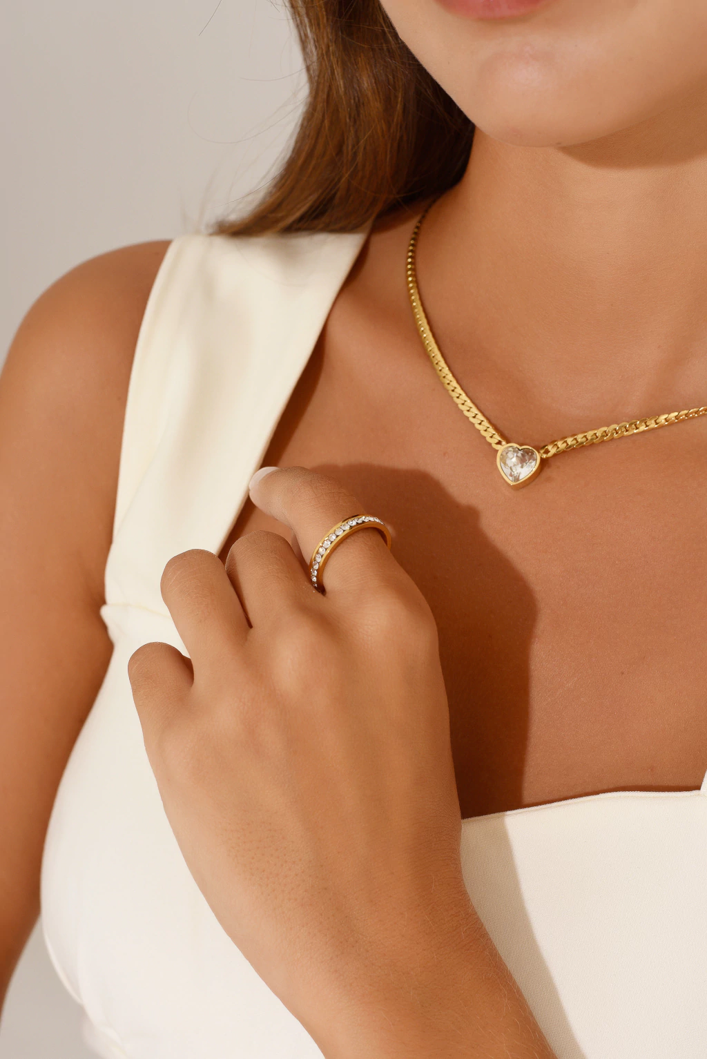 Anillo de acero inoxidable con baño de Oro 18K. Piedras circonias cúbicas incrustradas. Posee brillo similar a los diamantes.